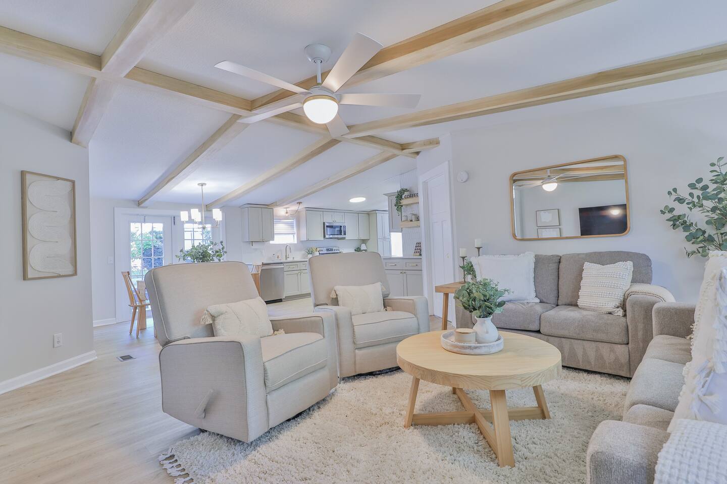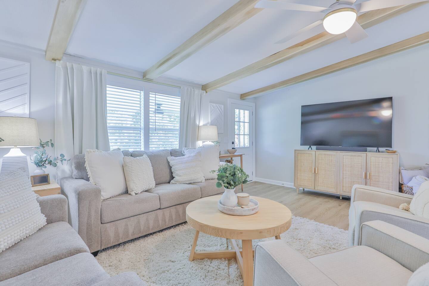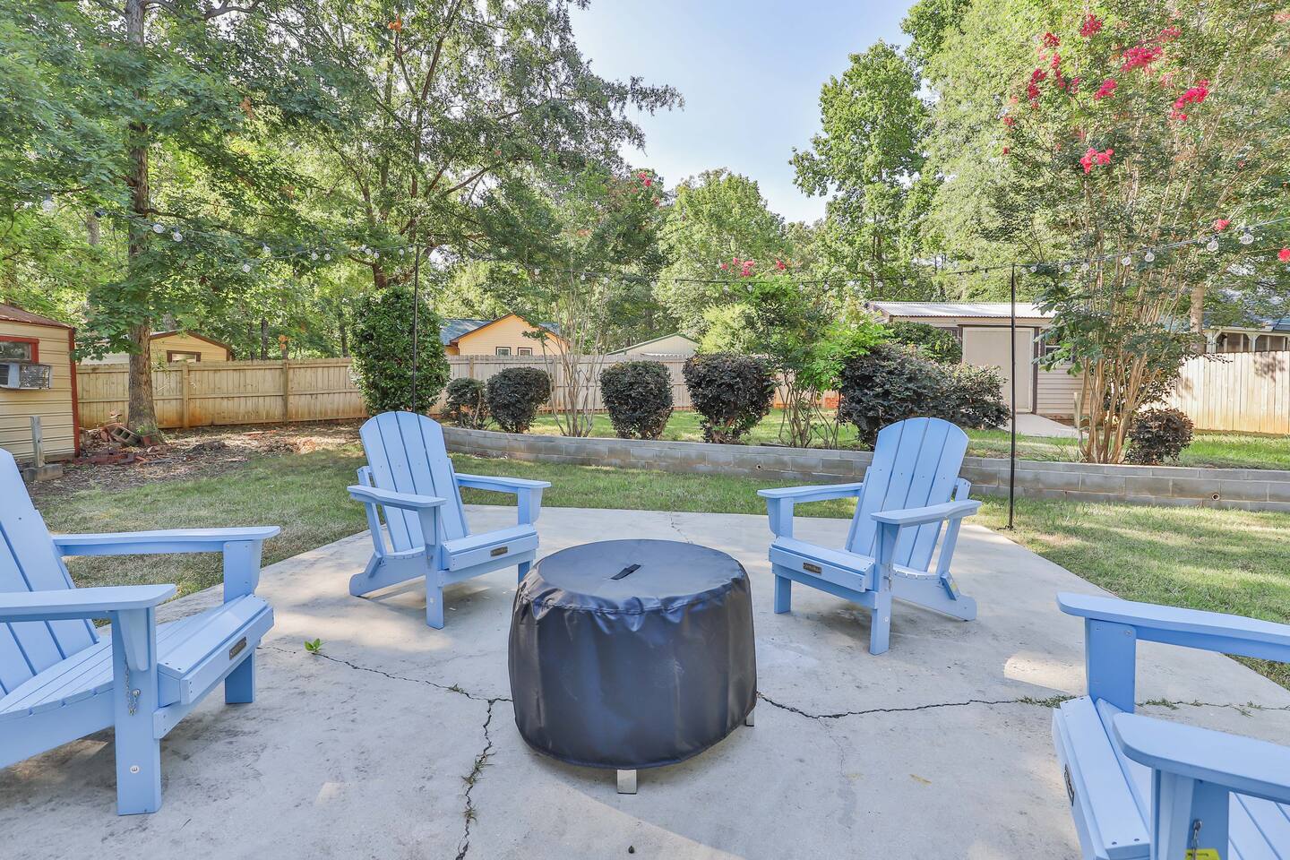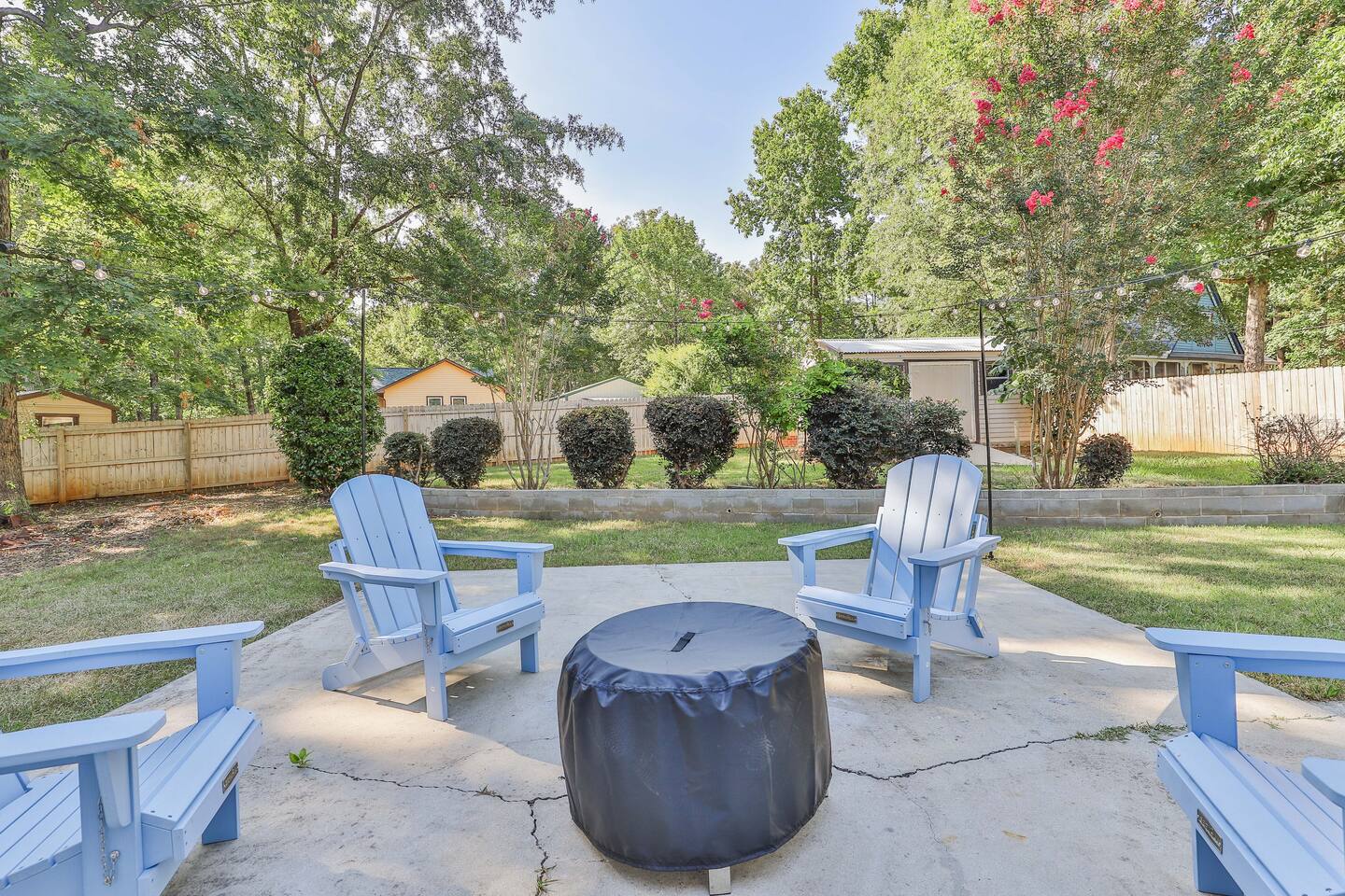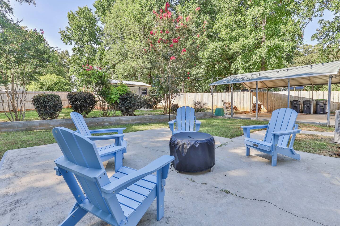 Short term Rental Permit #:2500575 This single-story, 3-bedroom, 2-bathroom home features a stunning open-concept living space highlighted by vaulted beam ceilings. It’s an inviting area for everyone to gather and socialize. * Living & Dining: Relax in spinning recliners or on the comfortable sofa, which contains a queen-size memory foam mattress. Enjoy your favorite shows on the 65-inch Smart TV with a Roku soundbar. The farmhouse dining table seats six, with French doors that open directly to the private backyard. * Kitchen & Coffee Bar: The fully stocked kitchen is a chef's delight, featuring quartz countertops, soft-close cabinets, and stainless steel appliances, including a fridge that makes craftsman-style ice. A dedicated coffee bar offers both K-cup and drip coffee options, along with a cocktail shaker, and wine glasses. * Bedrooms: All bedrooms include memory foam mattresses and fresh white linens for a restful night's sleep. ** Bedroom 1: King bed, 32" Smart TV, and a private en-suite bathroom. ** Bedroom 2: Queen bed, 32" Smart TV, and dimmable wall sconces perfect for reading. ** Bedroom 3: Two Twin beds and a 24" Smart TV. * Bathrooms: The master en-suite features double sinks and a spacious tile shower with a rain shower head. The second bathroom, located in the hall, offers a full shower/tub combo. * Outdoor Living: Your private, fenced-in backyard is an oasis. Spend evenings under the cafe lights, gathered around the wood-burning fire pit in comfortable Adirondack chairs. (Please note: Firewood is not provided). There is also a gas grill provided for grilling. * Dedicated Work & Pet Space: A quiet work desk with high-speed internet and a charging station is available for remote work. We also have a special nook for your dog with food and water bowls. * Laundry: A full-size washer and dryer are available for your use. (Please note: Laundry detergent is not provided).