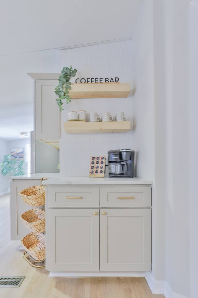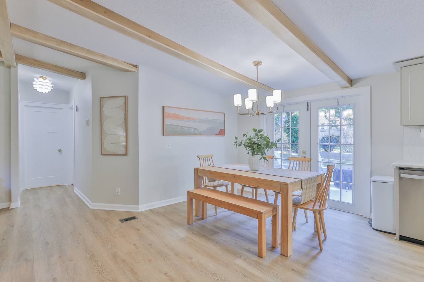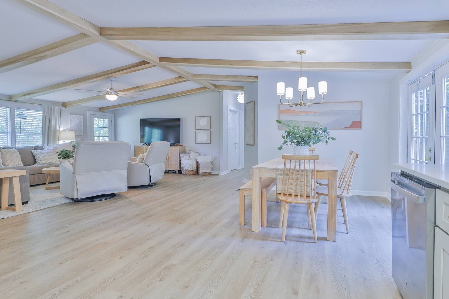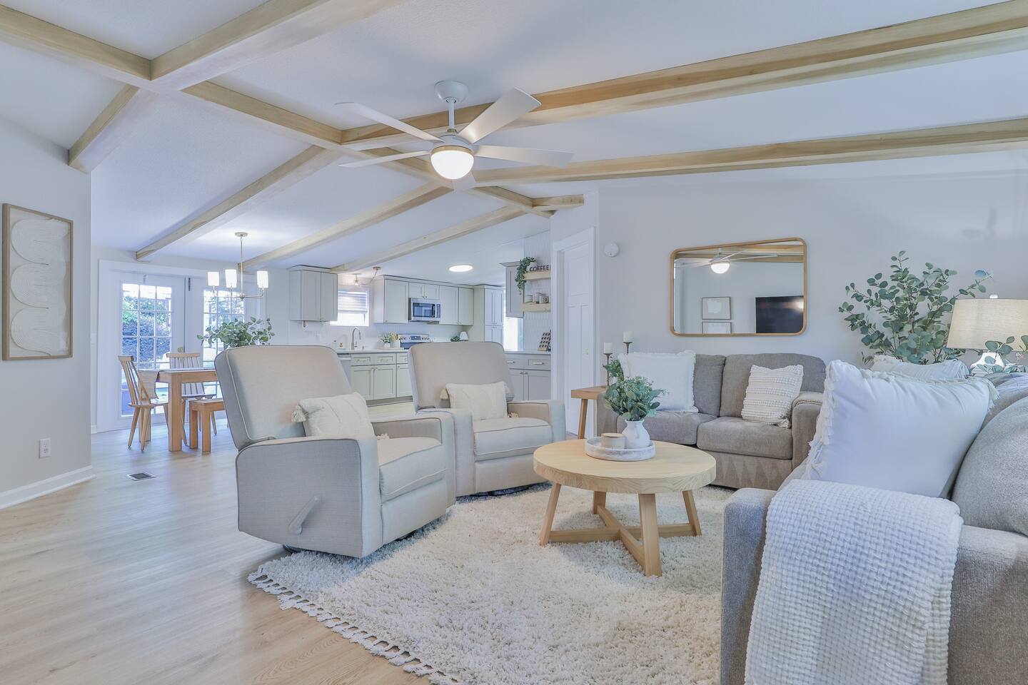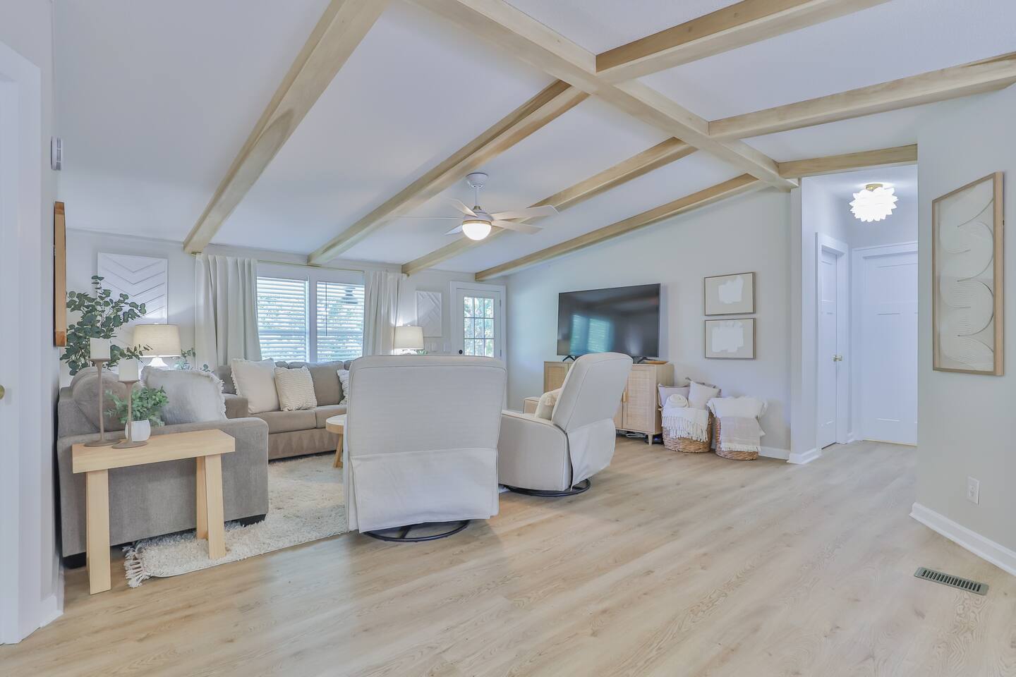 Short term Rental Permit #:2500575 This single-story, 3-bedroom, 2-bathroom home features a stunning open-concept living space highlighted by vaulted beam ceilings. It’s an inviting area for everyone to gather and socialize. * Living & Dining: Relax in spinning recliners or on the comfortable sofa, which contains a queen-size memory foam mattress. Enjoy your favorite shows on the 65-inch Smart TV with a Roku soundbar. The farmhouse dining table seats six, with French doors that open directly to the private backyard. * Kitchen & Coffee Bar: The fully stocked kitchen is a chef's delight, featuring quartz countertops, soft-close cabinets, and stainless steel appliances, including a fridge that makes craftsman-style ice. A dedicated coffee bar offers both K-cup and drip coffee options, along with a cocktail shaker, and wine glasses. * Bedrooms: All bedrooms include memory foam mattresses and fresh white linens for a restful night's sleep. ** Bedroom 1: King bed, 32" Smart TV, and a private en-suite bathroom. ** Bedroom 2: Queen bed, 32" Smart TV, and dimmable wall sconces perfect for reading. ** Bedroom 3: Two Twin beds and a 24" Smart TV. * Bathrooms: The master en-suite features double sinks and a spacious tile shower with a rain shower head. The second bathroom, located in the hall, offers a full shower/tub combo. * Outdoor Living: Your private, fenced-in backyard is an oasis. Spend evenings under the cafe lights, gathered around the wood-burning fire pit in comfortable Adirondack chairs. (Please note: Firewood is not provided). There is also a gas grill provided for grilling. * Dedicated Work & Pet Space: A quiet work desk with high-speed internet and a charging station is available for remote work. We also have a special nook for your dog with food and water bowls. * Laundry: A full-size washer and dryer are available for your use. (Please note: Laundry detergent is not provided).