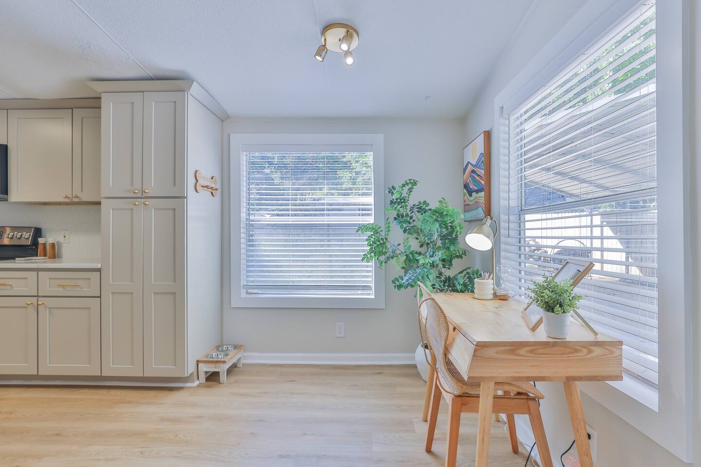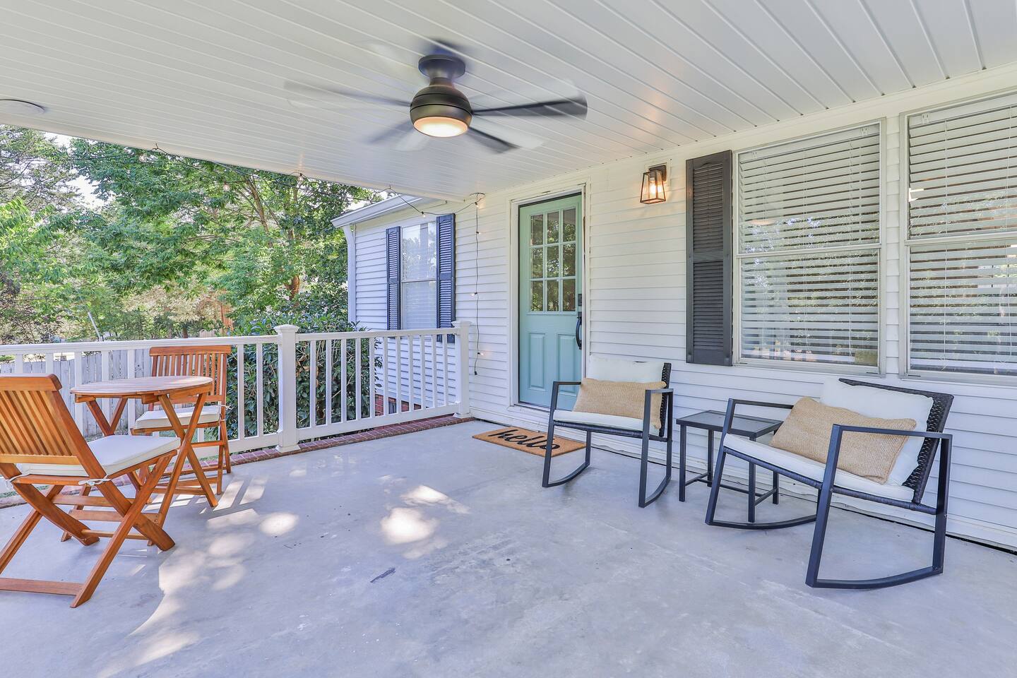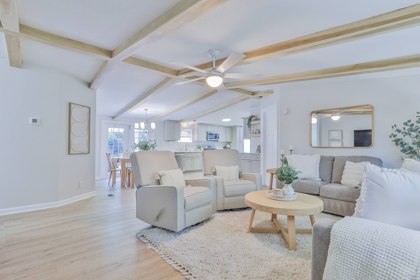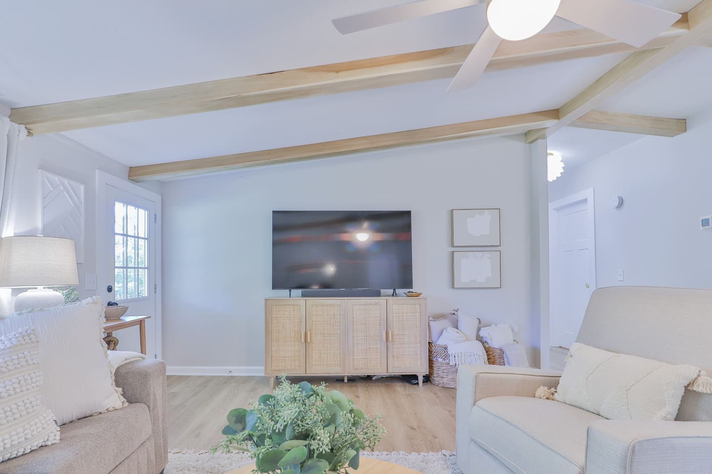 Short term Rental Permit #:2500575 This single-story, 3-bedroom, 2-bathroom home features a stunning open-concept living space highlighted by vaulted beam ceilings. It’s an inviting area for everyone to gather and socialize. * Living & Dining: Relax in spinning recliners or on the comfortable sofa, which contains a queen-size memory foam mattress. Enjoy your favorite shows on the 65-inch Smart TV with a Roku soundbar. The farmhouse dining table seats six, with French doors that open directly to the private backyard. * Kitchen & Coffee Bar: The fully stocked kitchen is a chef's delight, featuring quartz countertops, soft-close cabinets, and stainless steel appliances, including a fridge that makes craftsman-style ice. A dedicated coffee bar offers both K-cup and drip coffee options, along with a cocktail shaker, and wine glasses. * Bedrooms: All bedrooms include memory foam mattresses and fresh white linens for a restful night's sleep. ** Bedroom 1: King bed, 32" Smart TV, and a private en-suite bathroom. ** Bedroom 2: Queen bed, 32" Smart TV, and dimmable wall sconces perfect for reading. ** Bedroom 3: Two Twin beds and a 24" Smart TV. * Bathrooms: The master en-suite features double sinks and a spacious tile shower with a rain shower head. The second bathroom, located in the hall, offers a full shower/tub combo. * Outdoor Living: Your private, fenced-in backyard is an oasis. Spend evenings under the cafe lights, gathered around the wood-burning fire pit in comfortable Adirondack chairs. (Please note: Firewood is not provided). There is also a gas grill provided for grilling. * Dedicated Work & Pet Space: A quiet work desk with high-speed internet and a charging station is available for remote work. We also have a special nook for your dog with food and water bowls. * Laundry: A full-size washer and dryer are available for your use. (Please note: Laundry detergent is not provided).