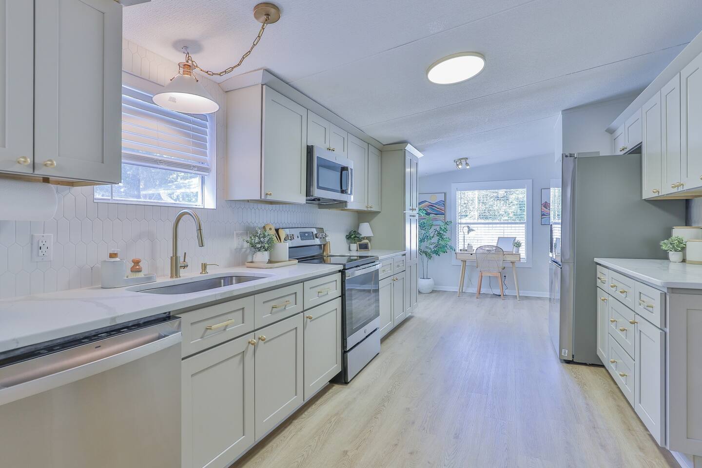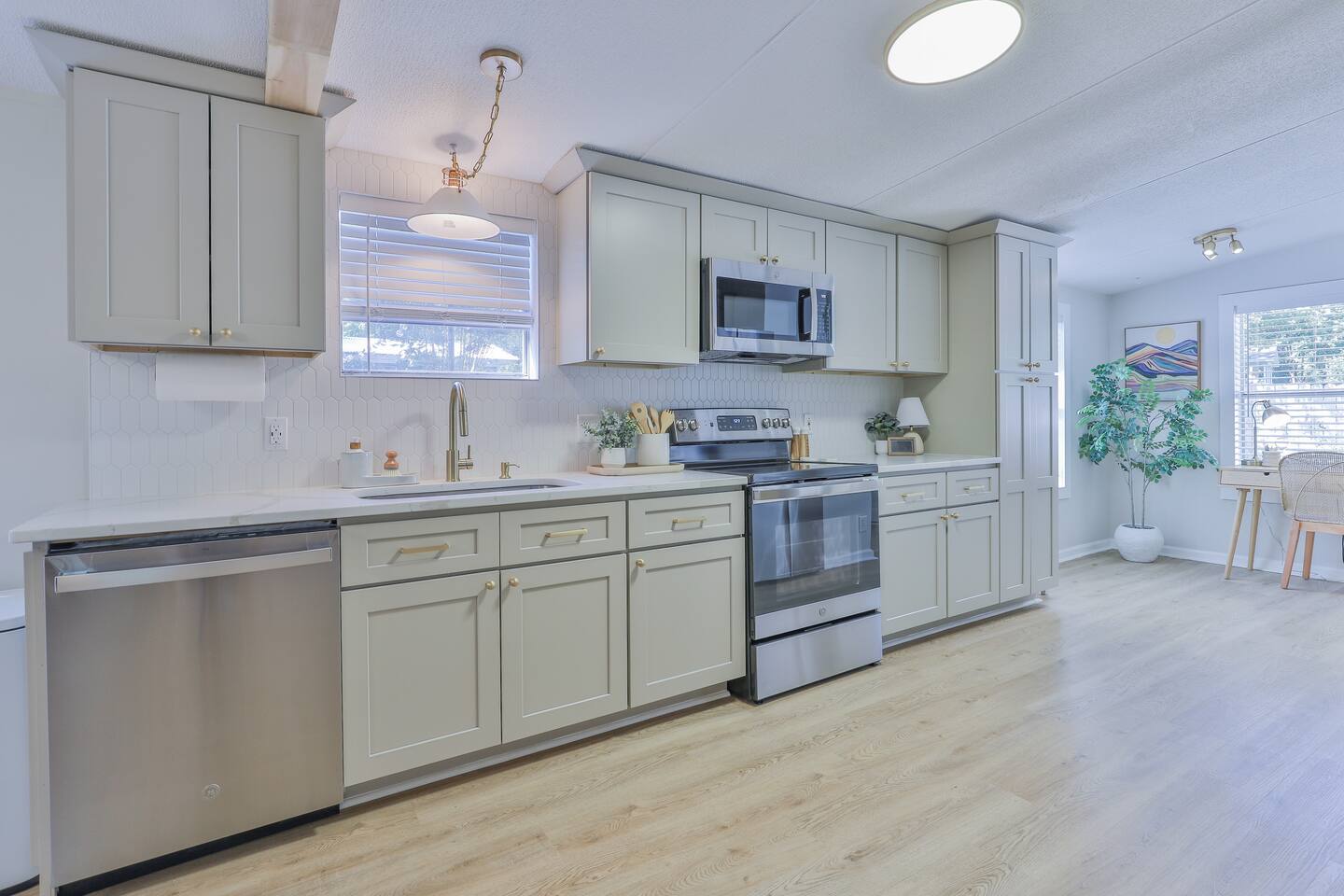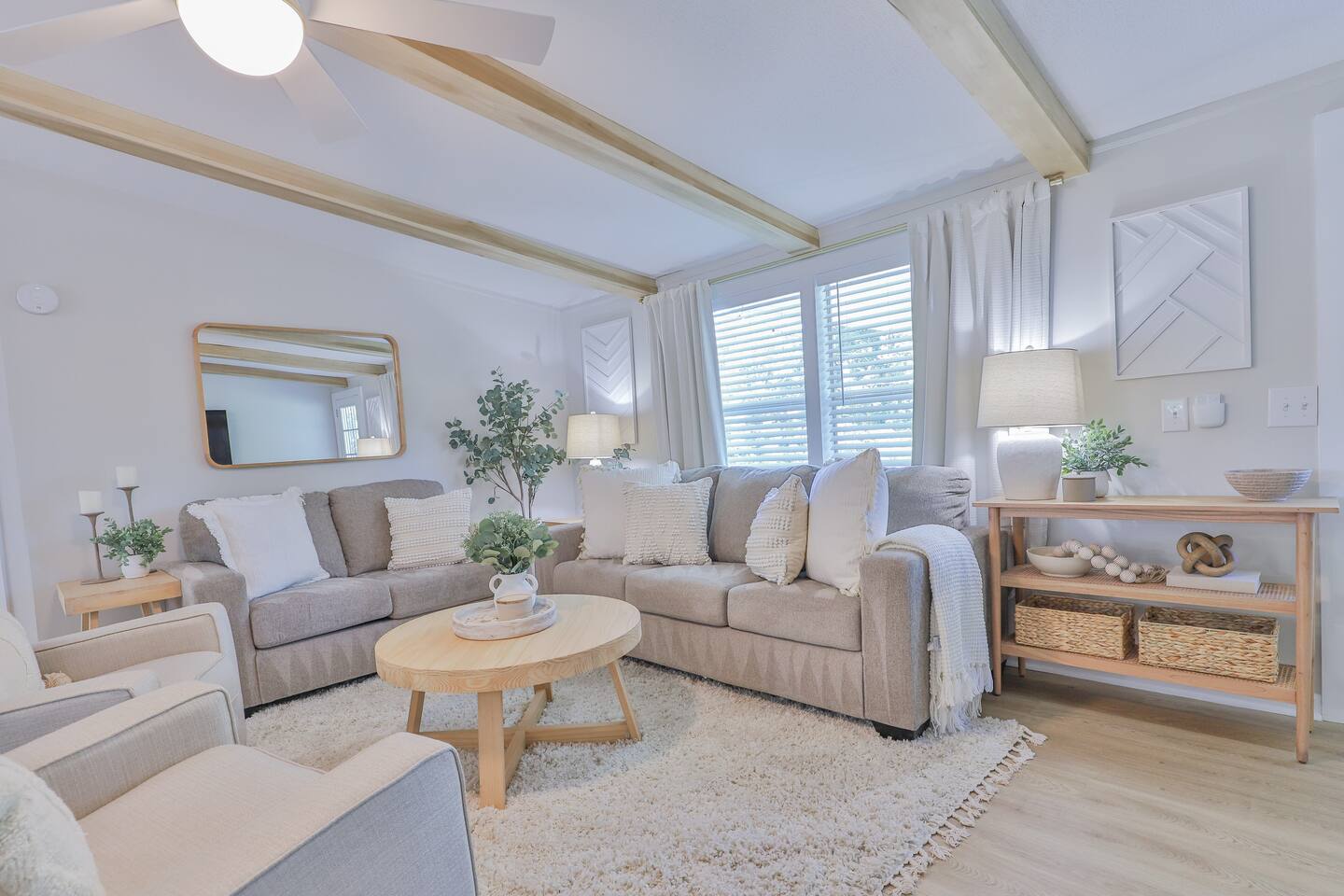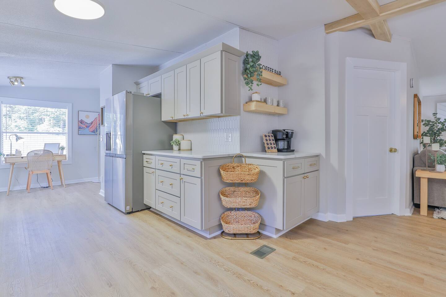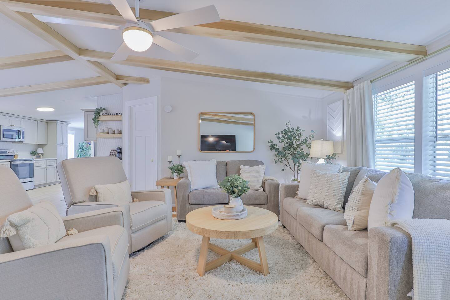 Short term Rental Permit #:2500575 This single-story, 3-bedroom, 2-bathroom home features a stunning open-concept living space highlighted by vaulted beam ceilings. It’s an inviting area for everyone to gather and socialize. * Living & Dining: Relax in spinning recliners or on the comfortable sofa, which contains a queen-size memory foam mattress. Enjoy your favorite shows on the 65-inch Smart TV with a Roku soundbar. The farmhouse dining table seats six, with French doors that open directly to the private backyard. * Kitchen & Coffee Bar: The fully stocked kitchen is a chef's delight, featuring quartz countertops, soft-close cabinets, and stainless steel appliances, including a fridge that makes craftsman-style ice. A dedicated coffee bar offers both K-cup and drip coffee options, along with a cocktail shaker, and wine glasses. * Bedrooms: All bedrooms include memory foam mattresses and fresh white linens for a restful night's sleep. ** Bedroom 1: King bed, 32" Smart TV, and a private en-suite bathroom. ** Bedroom 2: Queen bed, 32" Smart TV, and dimmable wall sconces perfect for reading. ** Bedroom 3: Two Twin beds and a 24" Smart TV. * Bathrooms: The master en-suite features double sinks and a spacious tile shower with a rain shower head. The second bathroom, located in the hall, offers a full shower/tub combo. * Outdoor Living: Your private, fenced-in backyard is an oasis. Spend evenings under the cafe lights, gathered around the wood-burning fire pit in comfortable Adirondack chairs. (Please note: Firewood is not provided). There is also a gas grill provided for grilling. * Dedicated Work & Pet Space: A quiet work desk with high-speed internet and a charging station is available for remote work. We also have a special nook for your dog with food and water bowls. * Laundry: A full-size washer and dryer are available for your use. (Please note: Laundry detergent is not provided).