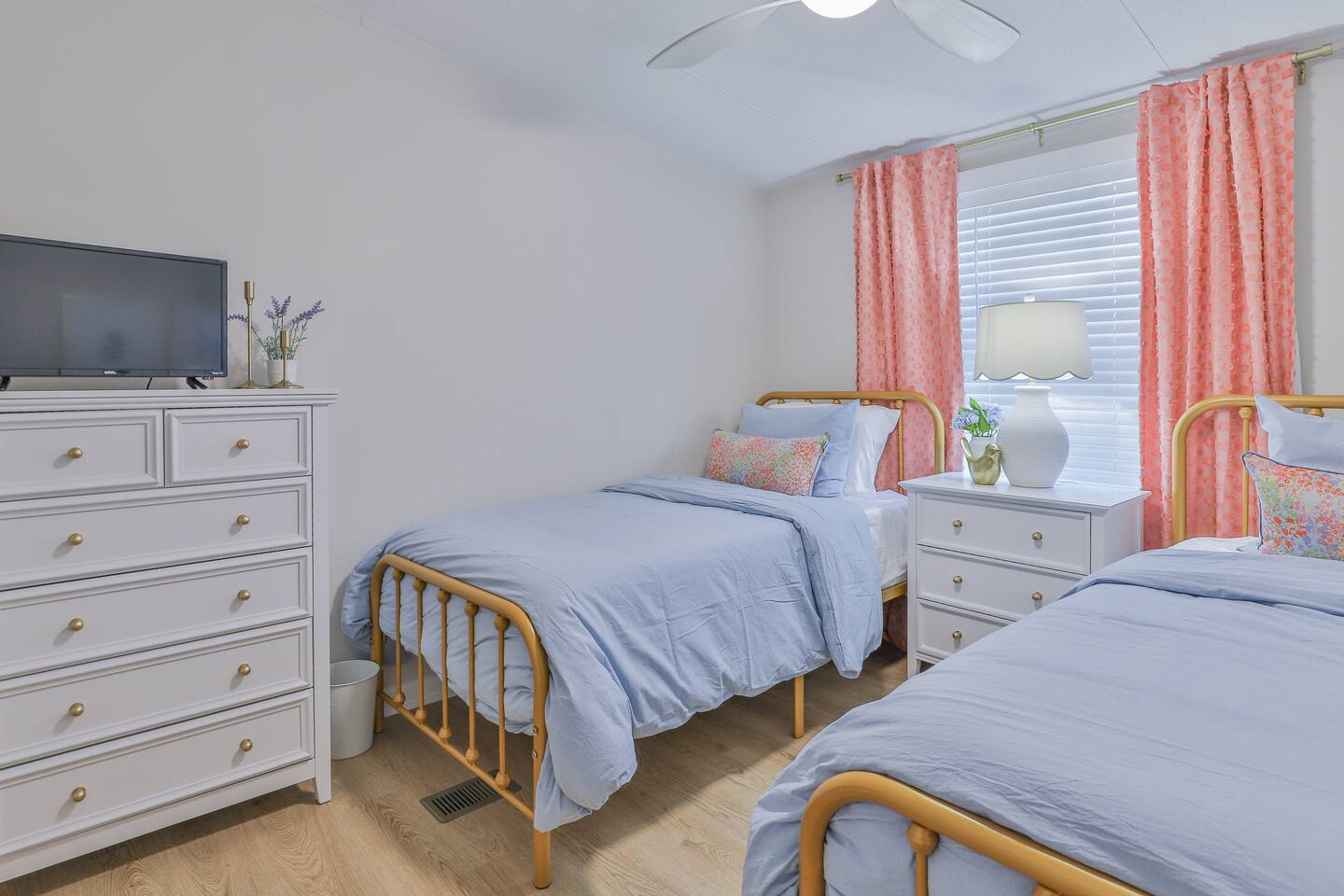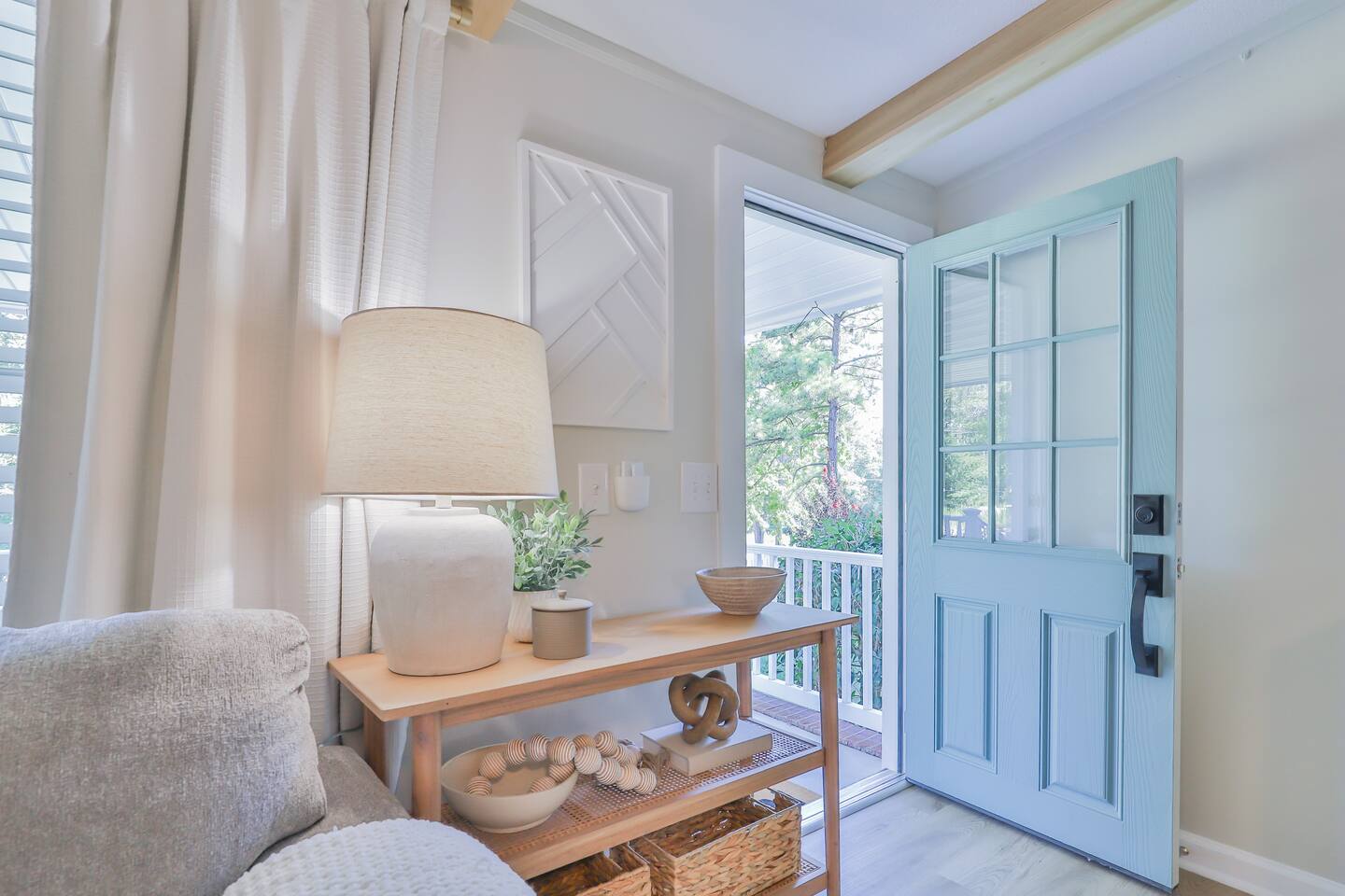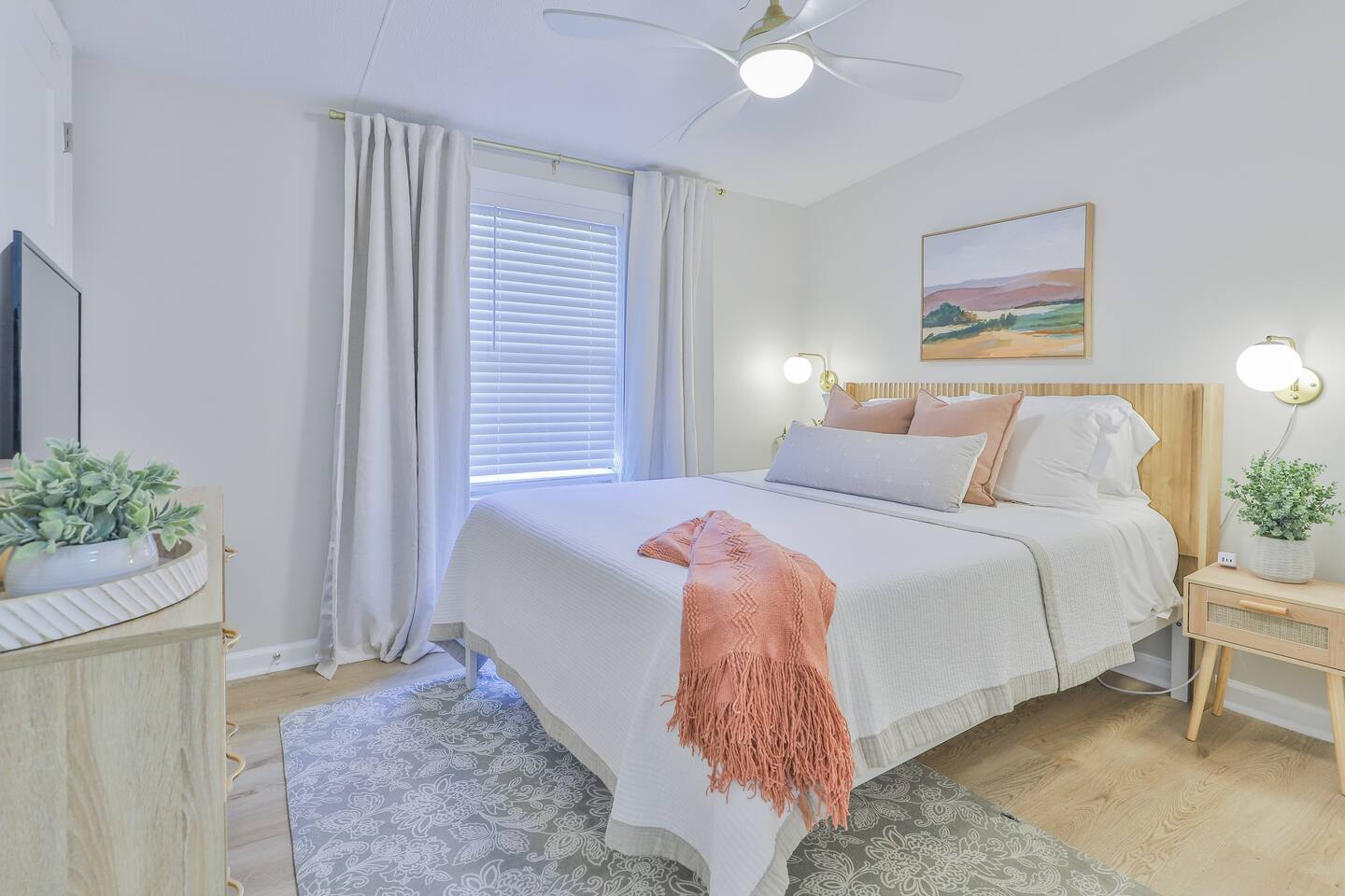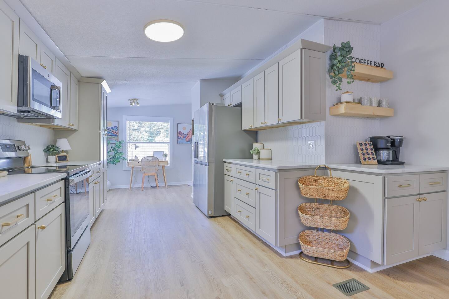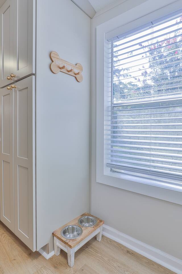 Short term Rental Permit #:2500575 This single-story, 3-bedroom, 2-bathroom home features a stunning open-concept living space highlighted by vaulted beam ceilings. It’s an inviting area for everyone to gather and socialize. * Living & Dining: Relax in spinning recliners or on the comfortable sofa, which contains a queen-size memory foam mattress. Enjoy your favorite shows on the 65-inch Smart TV with a Roku soundbar. The farmhouse dining table seats six, with French doors that open directly to the private backyard. * Kitchen & Coffee Bar: The fully stocked kitchen is a chef's delight, featuring quartz countertops, soft-close cabinets, and stainless steel appliances, including a fridge that makes craftsman-style ice. A dedicated coffee bar offers both K-cup and drip coffee options, along with a cocktail shaker, and wine glasses. * Bedrooms: All bedrooms include memory foam mattresses and fresh white linens for a restful night's sleep. ** Bedroom 1: King bed, 32" Smart TV, and a private en-suite bathroom. ** Bedroom 2: Queen bed, 32" Smart TV, and dimmable wall sconces perfect for reading. ** Bedroom 3: Two Twin beds and a 24" Smart TV. * Bathrooms: The master en-suite features double sinks and a spacious tile shower with a rain shower head. The second bathroom, located in the hall, offers a full shower/tub combo. * Outdoor Living: Your private, fenced-in backyard is an oasis. Spend evenings under the cafe lights, gathered around the wood-burning fire pit in comfortable Adirondack chairs. (Please note: Firewood is not provided). There is also a gas grill provided for grilling. * Dedicated Work & Pet Space: A quiet work desk with high-speed internet and a charging station is available for remote work. We also have a special nook for your dog with food and water bowls. * Laundry: A full-size washer and dryer are available for your use. (Please note: Laundry detergent is not provided).