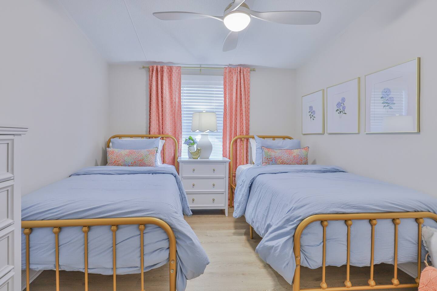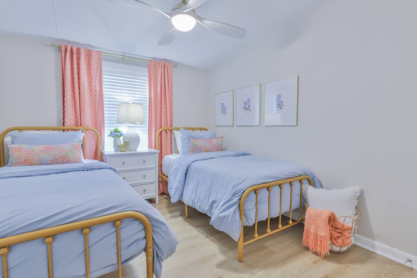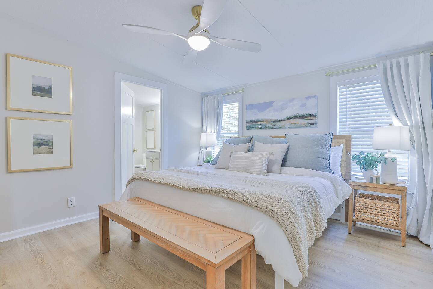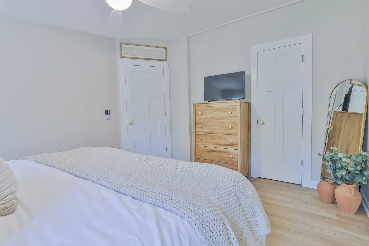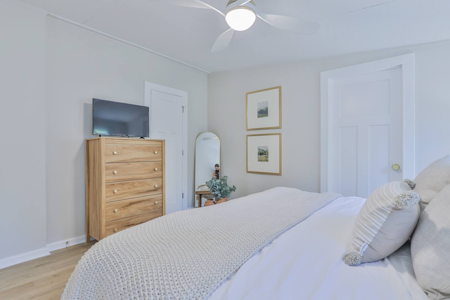Short term Rental Permit #:2500575 This single-story, 3-bedroom, 2-bathroom home features a stunning open-concept living space highlighted by vaulted beam ceilings. It’s an inviting area for everyone to gather and socialize. * Living & Dining: Relax in spinning recliners or on the comfortable sofa, which contains a queen-size memory foam mattress. Enjoy your favorite shows on the 65-inch Smart TV with a Roku soundbar. The farmhouse dining table seats six, with French doors that open directly to the private backyard. * Kitchen & Coffee Bar: The fully stocked kitchen is a chef's delight, featuring quartz countertops, soft-close cabinets, and stainless steel appliances, including a fridge that makes craftsman-style ice. A dedicated coffee bar offers both K-cup and drip coffee options, along with a cocktail shaker, and wine glasses. * Bedrooms: All bedrooms include memory foam mattresses and fresh white linens for a restful night's sleep. ** Bedroom 1: King bed, 32" Smart TV, and a private en-suite bathroom. ** Bedroom 2: Queen bed, 32" Smart TV, and dimmable wall sconces perfect for reading. ** Bedroom 3: Two Twin beds and a 24" Smart TV. * Bathrooms: The master en-suite features double sinks and a spacious tile shower with a rain shower head. The second bathroom, located in the hall, offers a full shower/tub combo. * Outdoor Living: Your private, fenced-in backyard is an oasis. Spend evenings under the cafe lights, gathered around the wood-burning fire pit in comfortable Adirondack chairs. (Please note: Firewood is not provided). There is also a gas grill provided for grilling. * Dedicated Work & Pet Space: A quiet work desk with high-speed internet and a charging station is available for remote work. We also have a special nook for your dog with food and water bowls. * Laundry: A full-size washer and dryer are available for your use. (Please note: Laundry detergent is not provided).
